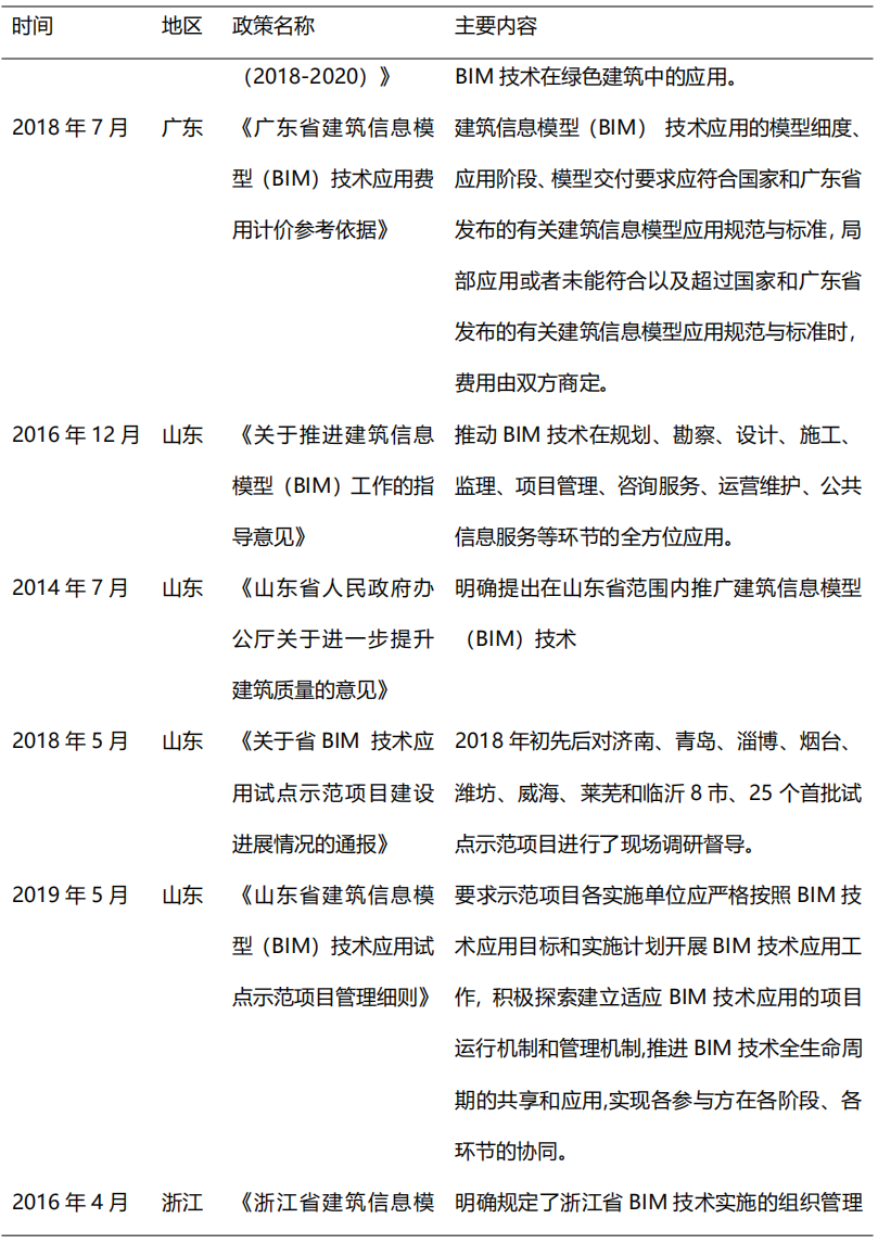從2014年開(kāi)始,在住建部的大力推動(dòng)下,各省市政策相繼出臺(tái)BIM推廣應(yīng)用文件,到目前我國(guó)已初步形成BIM技術(shù)應(yīng)用標(biāo)準(zhǔn)和政策體系,為BIM的快速發(fā)展奠定了堅(jiān)實(shí)的基礎(chǔ)。2017年,貴州、江西、河南等省市正式出臺(tái)BIM推廣意見(jiàn),明確提出在省級(jí)范圍內(nèi)提出推廣BIM技術(shù)應(yīng)用。2018-2019年,各地政府對(duì)于BIM技術(shù)的重視程度不減,重慶、北京、吉林、深圳等多地政策出臺(tái)指導(dǎo)意見(jiàn),旨在推動(dòng)BIM技術(shù)進(jìn)一步應(yīng)用普及。隨著我國(guó)出臺(tái)BIM推廣意見(jiàn)的省市數(shù)量逐漸增多,全國(guó)BIM技術(shù)應(yīng)用推廣的范圍更加廣泛。表2列舉了部分重要地方鼓勵(lì)政策。