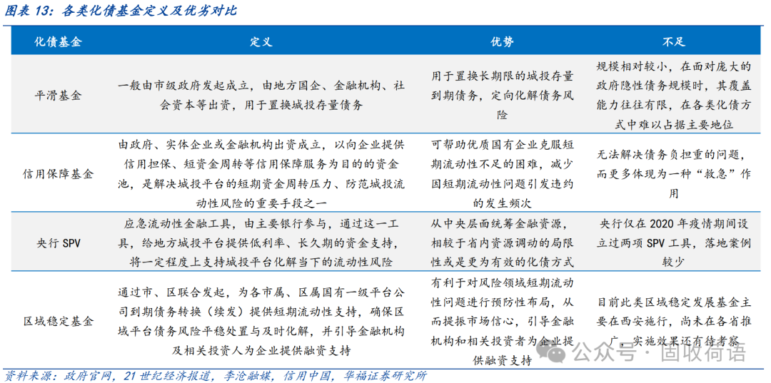 設(shè)立“化債基金”作為地方政府有效的管控城投債務(wù)風(fēng)險(xiǎn)的手段,被各地廣泛運(yùn)用,包括平滑基金、信用保障基金、央行SPV等。基金資金主要來(lái)源于省內(nèi)/市內(nèi),調(diào)動(dòng)的是區(qū)域內(nèi)的金融資源,但規(guī)模相對(duì)有限;SPV在投放貸款的同時(shí)或要求抵押品,因此國(guó)有資源更為豐富的區(qū)域預(yù)計(jì)將獲得更大的支持。